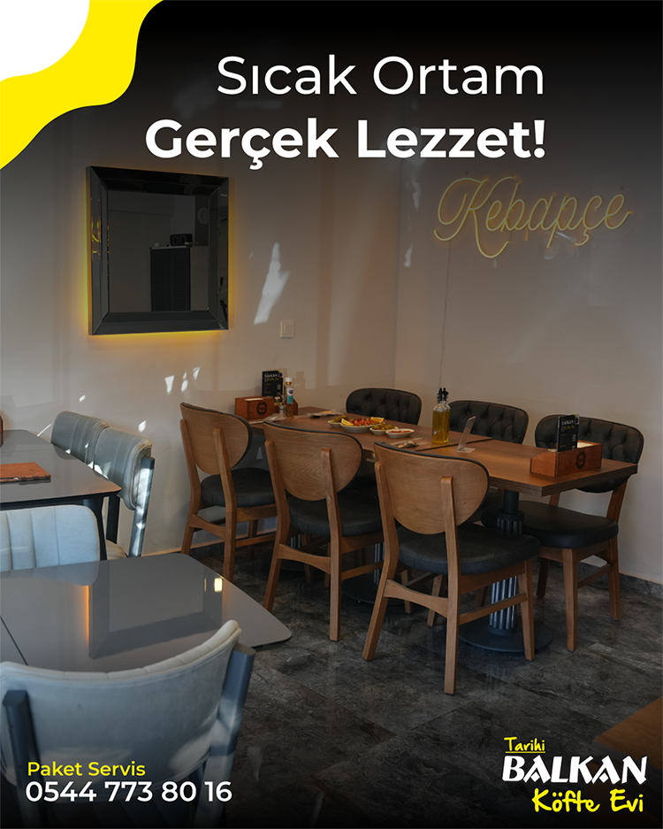 Tarihi Balkan Köftecisi olarak, yalnızca bir restoran değil; misafirlerimizi evlerinde hissettiren sıcak ve samimi bir buluşma noktası olmayı hedefliyoruz. Deneyimli ustalarımız, güler yüzlü ekibimiz ve konforlu mekânımızla her ziyaretinizde aynı kaliteyi ve lezzeti sunmak için özenle çalışıyoruz.